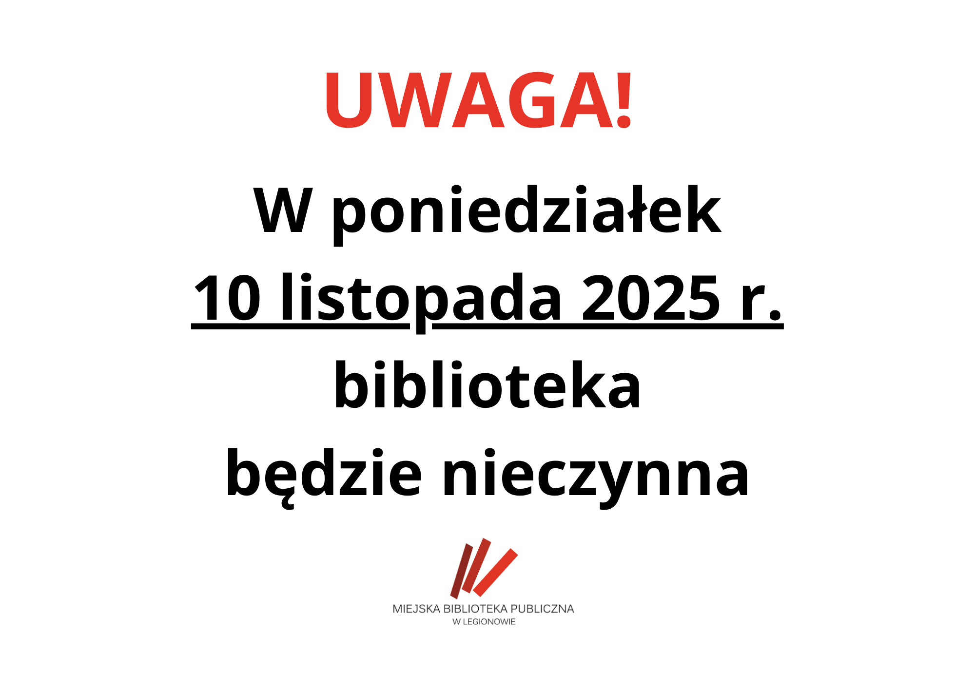 Biblioteka nieczynna 10 listopada Data publikacji: 2025-10-29 OStatnio zaktualizowano: 2025-10-29 Napisane przez: pawkawcag Informujemy, że w poniedziałek 10 listopada 2025 r. biblioteka (Poczytalnia oraz filie) będzie nieczynna. Dziękujemy za wyrozumiałość. Przejdź spowrotem do głównego menu