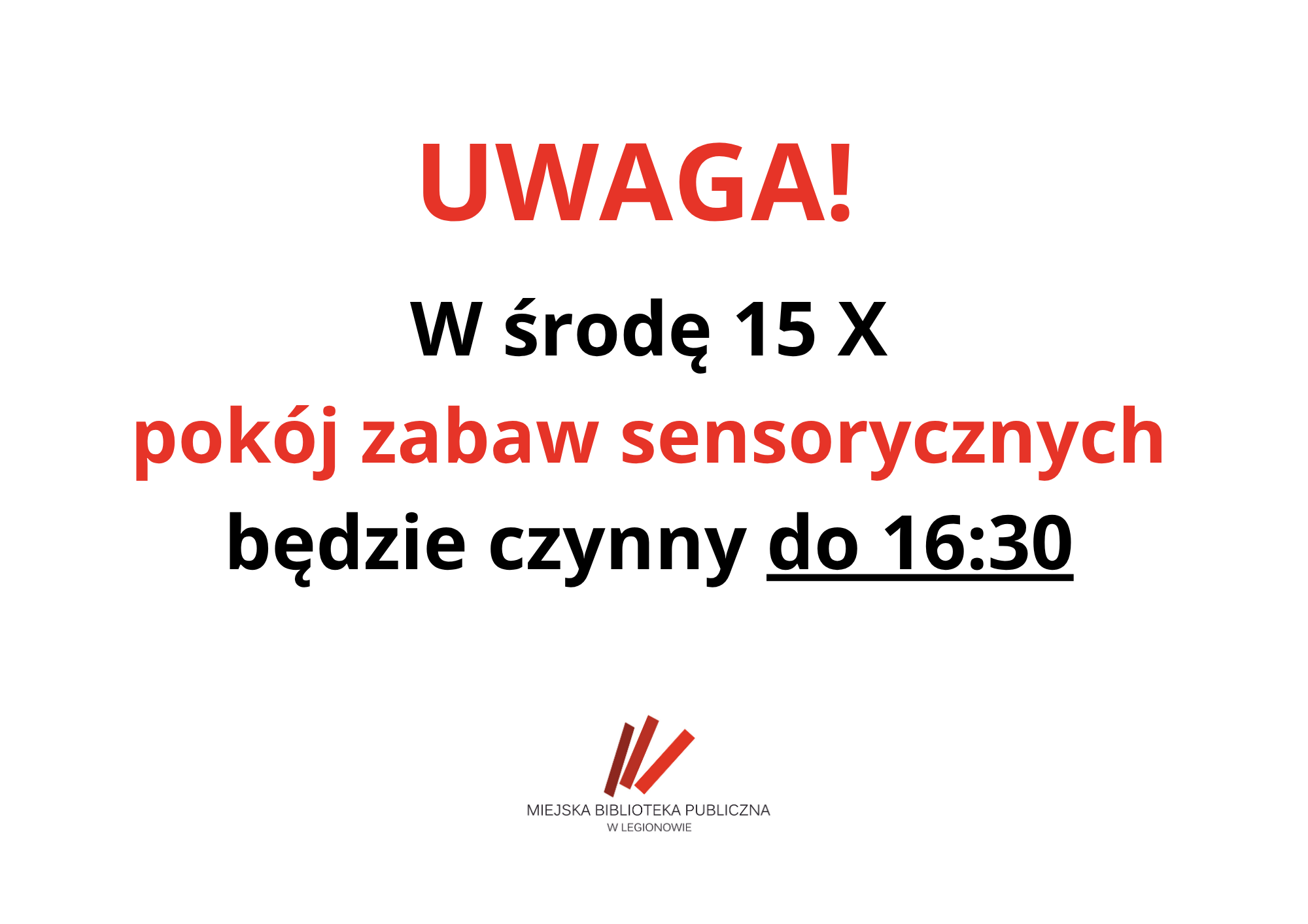 Informujemy, że w środę 15 października br. pokój zabaw sensorycznych będzie czynny do godz. 16.30 ze względu na odbywające się później wydarzenie: Spotkanie z położną. Wstęp wolny