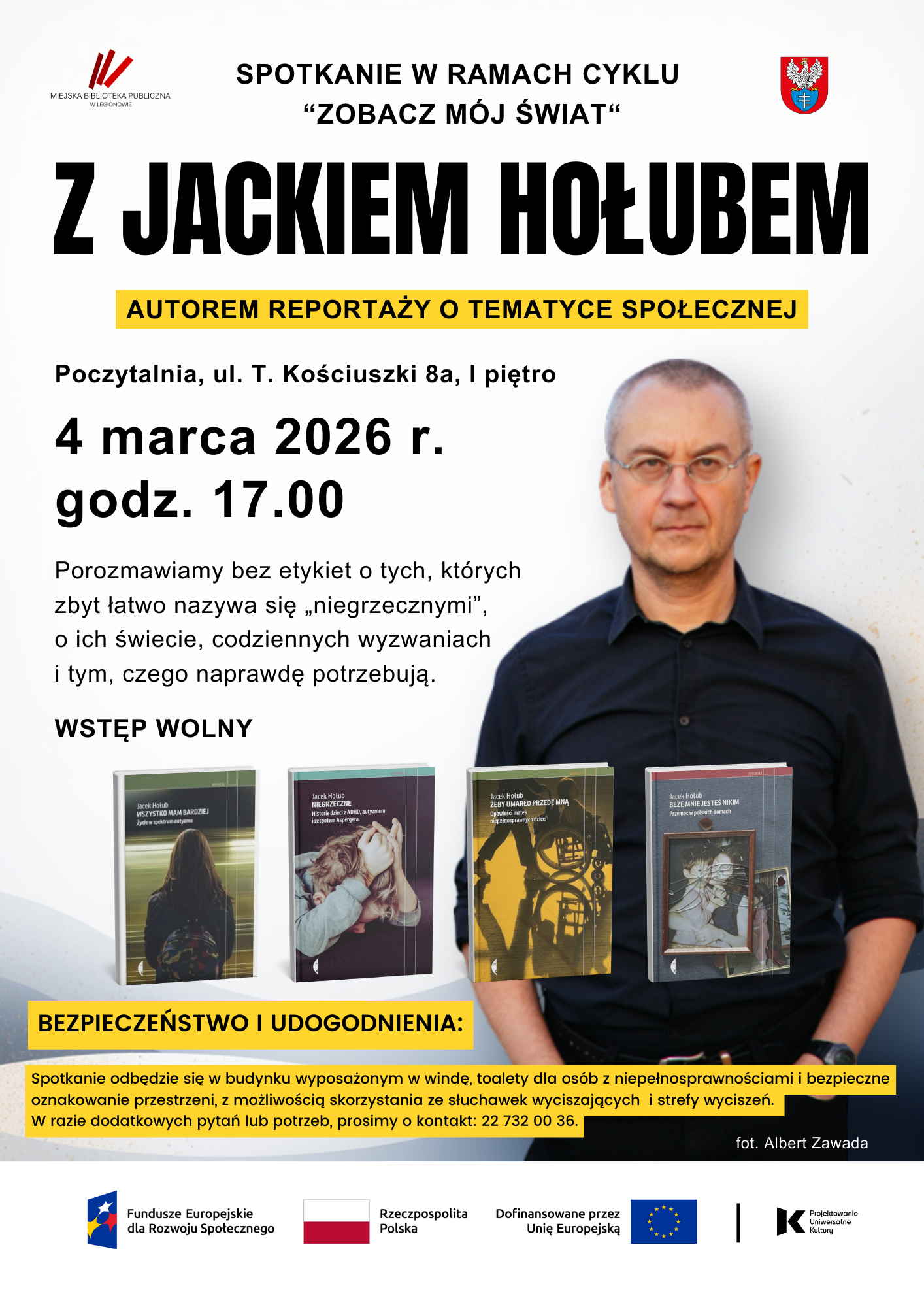 Zapraszamy na kolejne spotkanie autorskie z cyklu „Zobacz mój świat”, którego gościem będzie Jacek Hołub – autor książek reporterskich o tematyce społecznej: „Żeby umarło przede mną. Opowieści matek niepełnosprawnych dzieci”, „Niegrzeczne. Historie dzieci z ADHD, autyzmem i zespołem Aspergera”, „Beze mnie jesteś nikim. Przemoc w polskich domach” oraz „Wszystko mam bardziej. Życie w spektrum autyzmu”.
